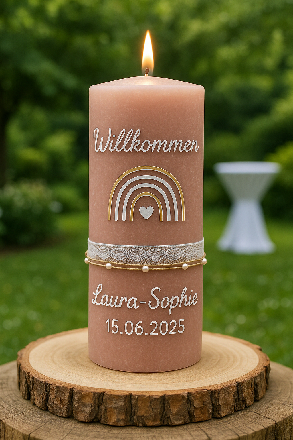 Es gibt bei einem Kinderwillkommensfest in dem Sinn keine Taufkerze wie bei einer religiösen Taufe, aber ihr könnt gerne eine Kerze für das Kinderwillkommensfest anfertigen lassen. Diese wird während der Zeremonie auch angezündet und stellt eine schönere Erinnerung dar.